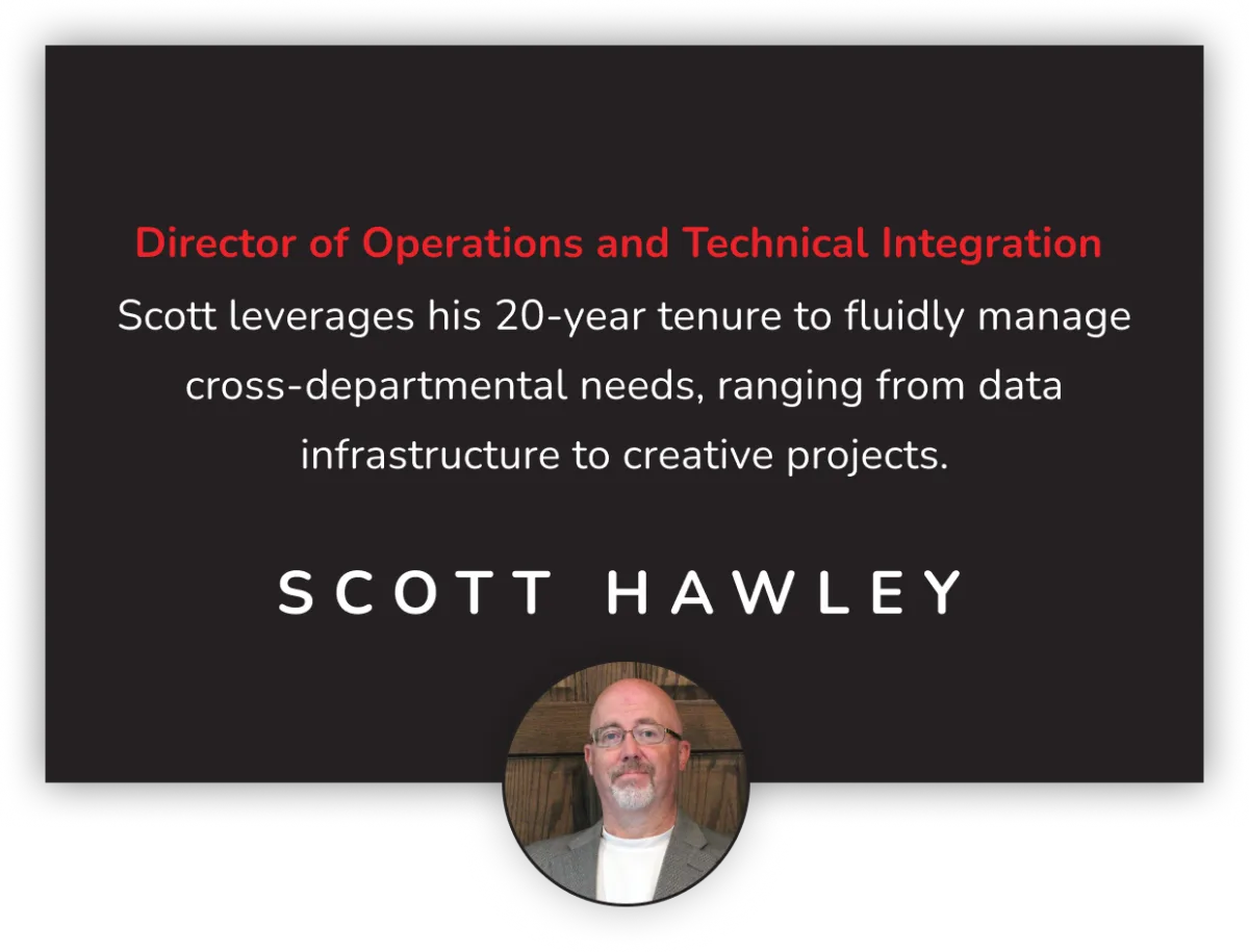 Scott leverages his 20-year tenure to fluidly manage cross-departmental needs, ranging from data infrastructure to creative projects.