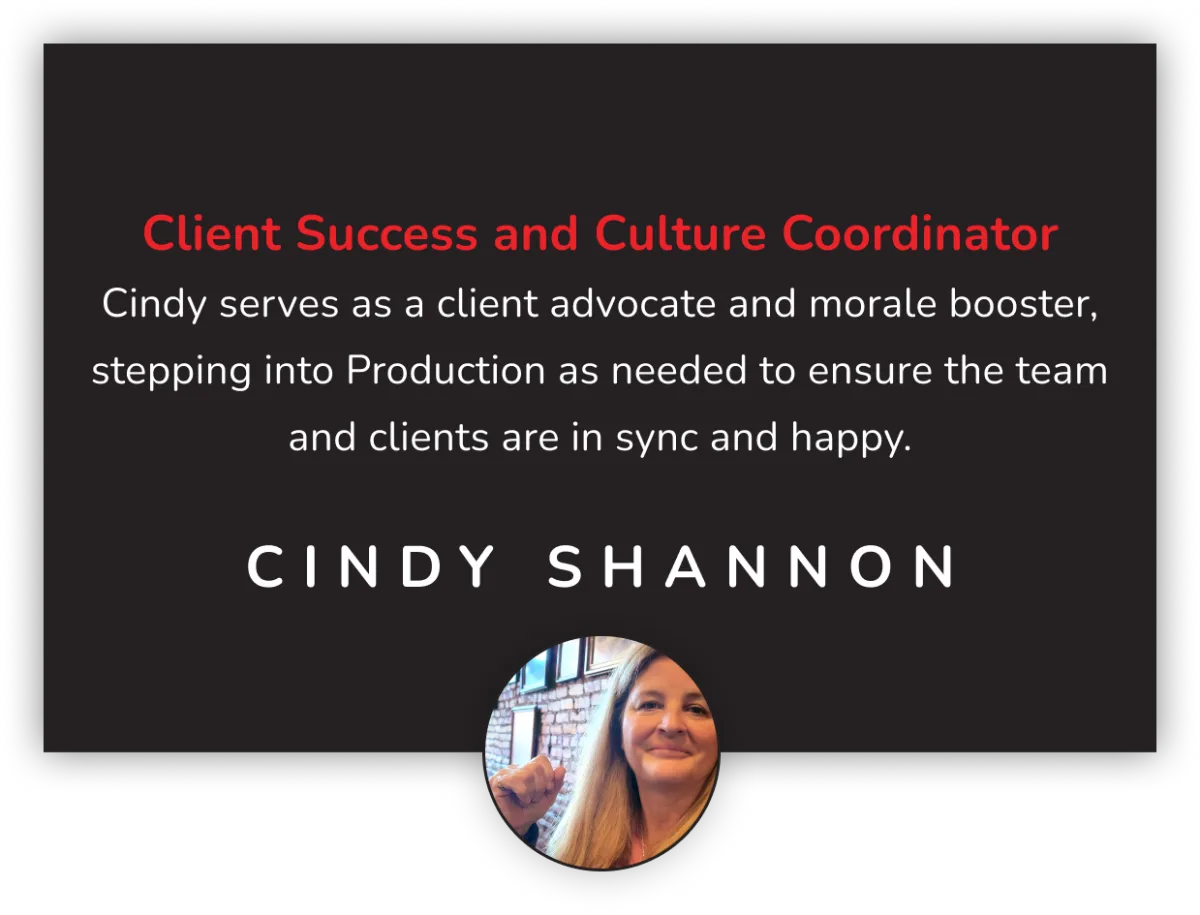 Cindy serves as a client advocate and morale booster, stepping into Production as needed to ensure the team and clients are in sync and happy.